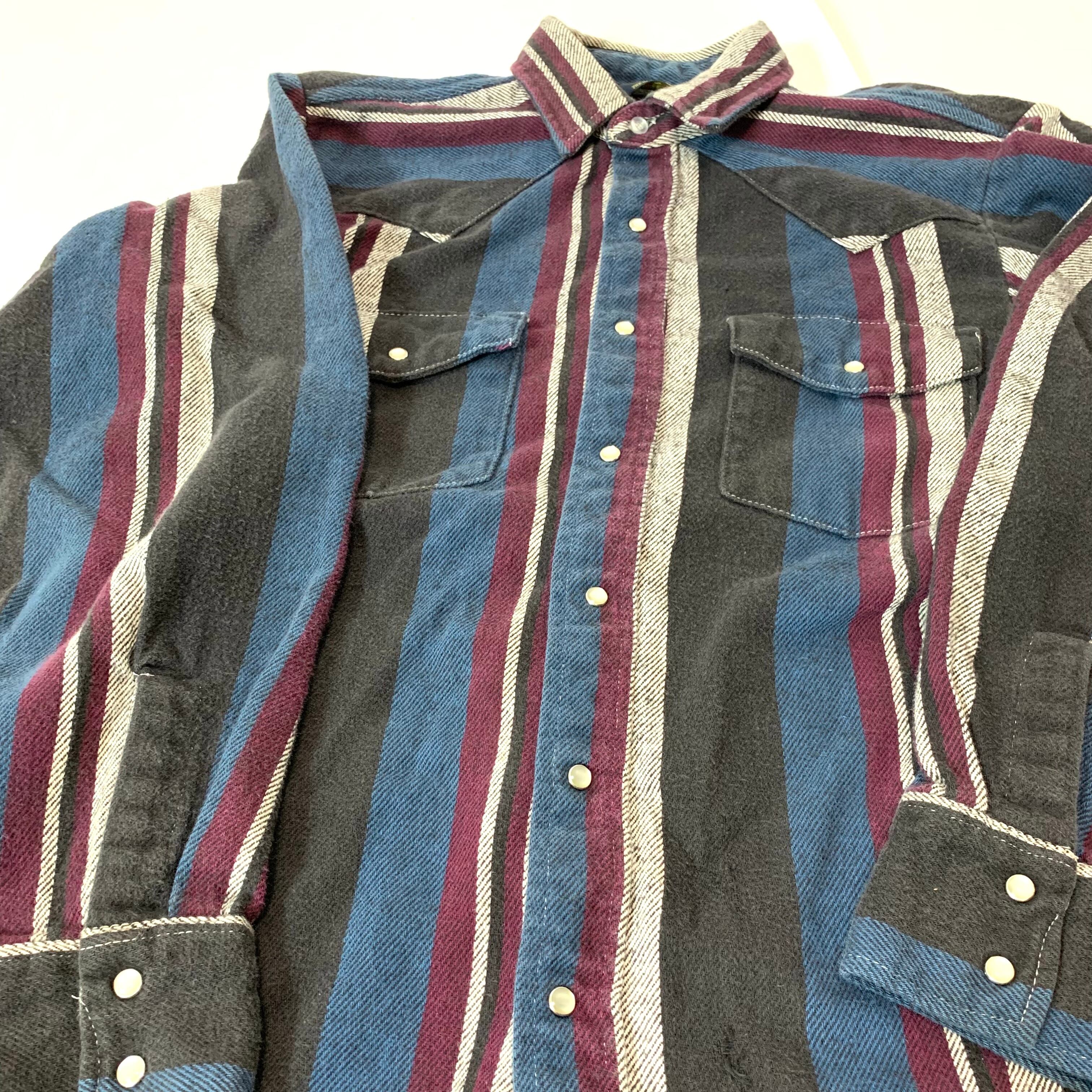 vintage old 90s OSH KOSH オシュコシュ 長袖 ストライプ柄 ウェスタンヘビーネルシャツ メンズ ブラック×ネイビー×パープル×ホワイト