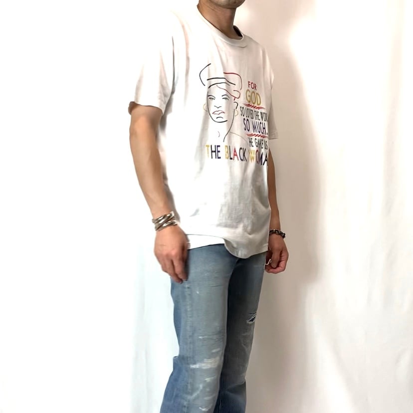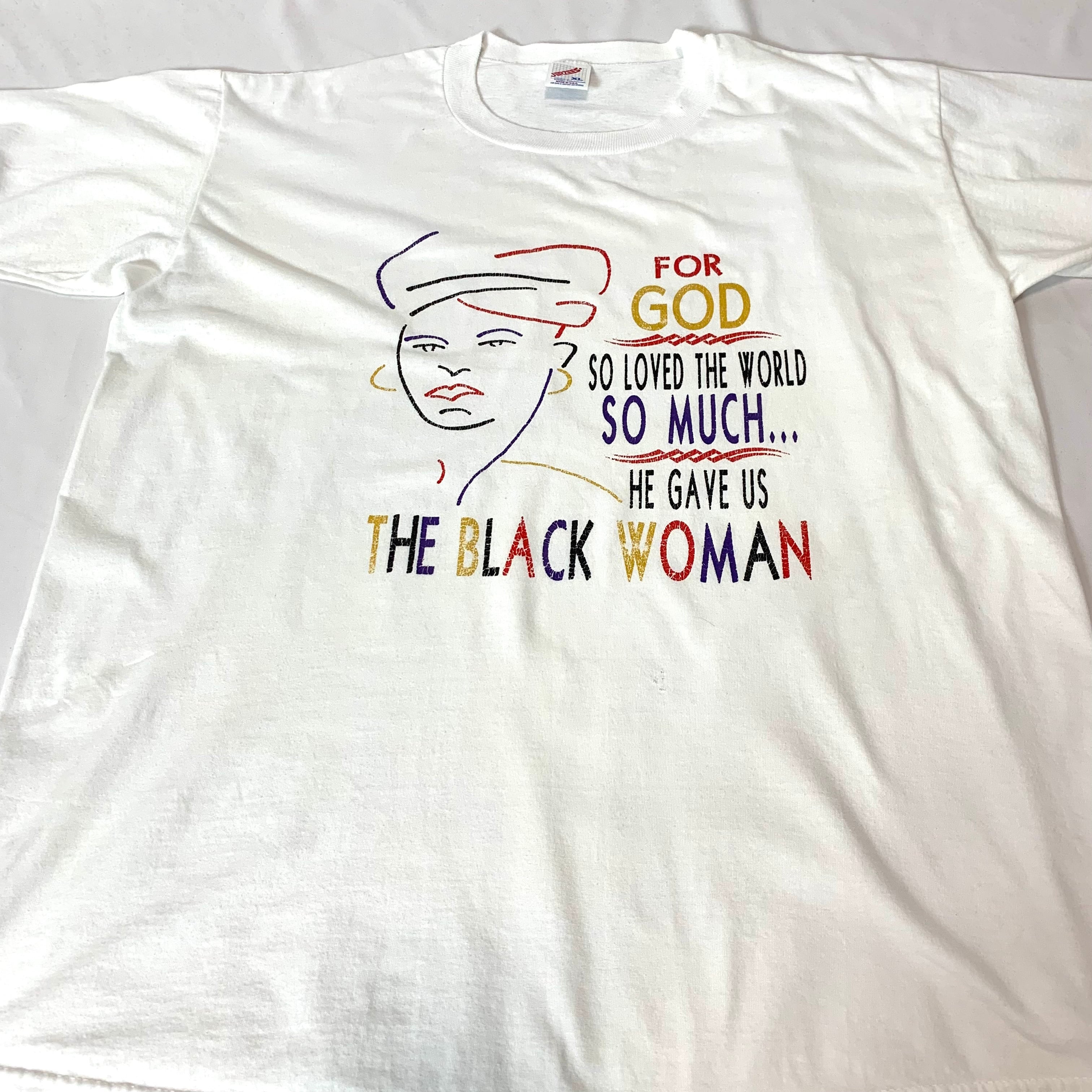 vintage 80s 90s print T-shirt THE BLACK WOMAN JERZEES MADE IN USA プリントTシャツ ジャージーズ アメリカ製 メンズ レディース ホワイト 白 size XL ビンテージ ヴィンテージ