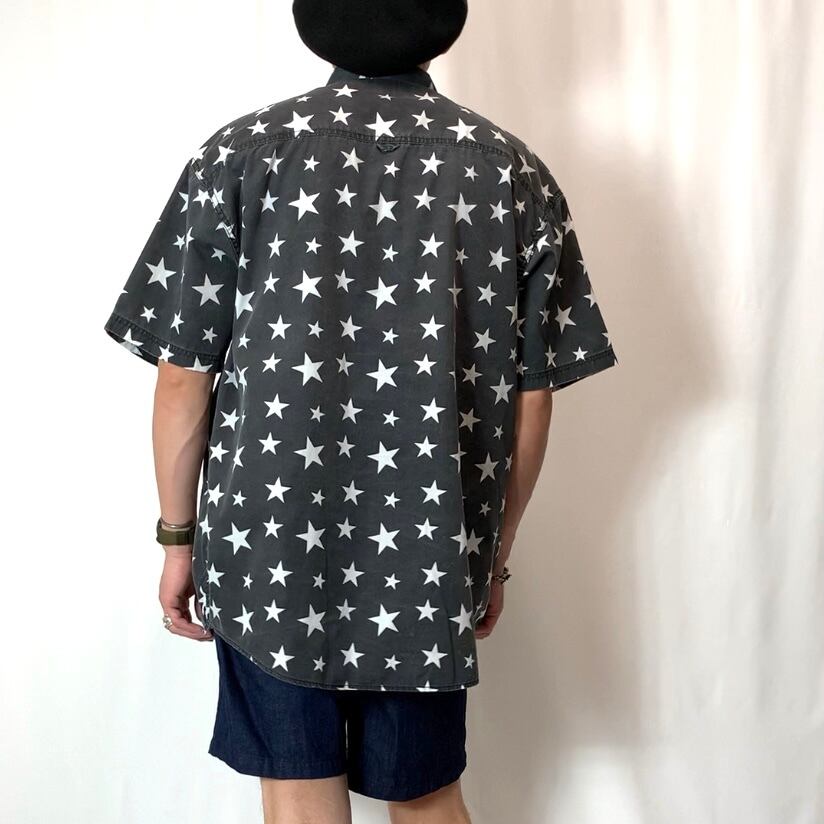 星柄のポップさとブラックベースのダークさの対象的な柄が目に付くシャツになります‼︎