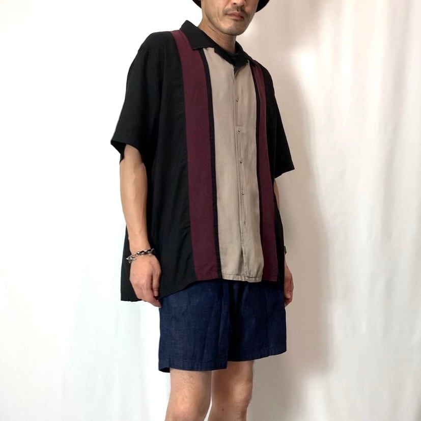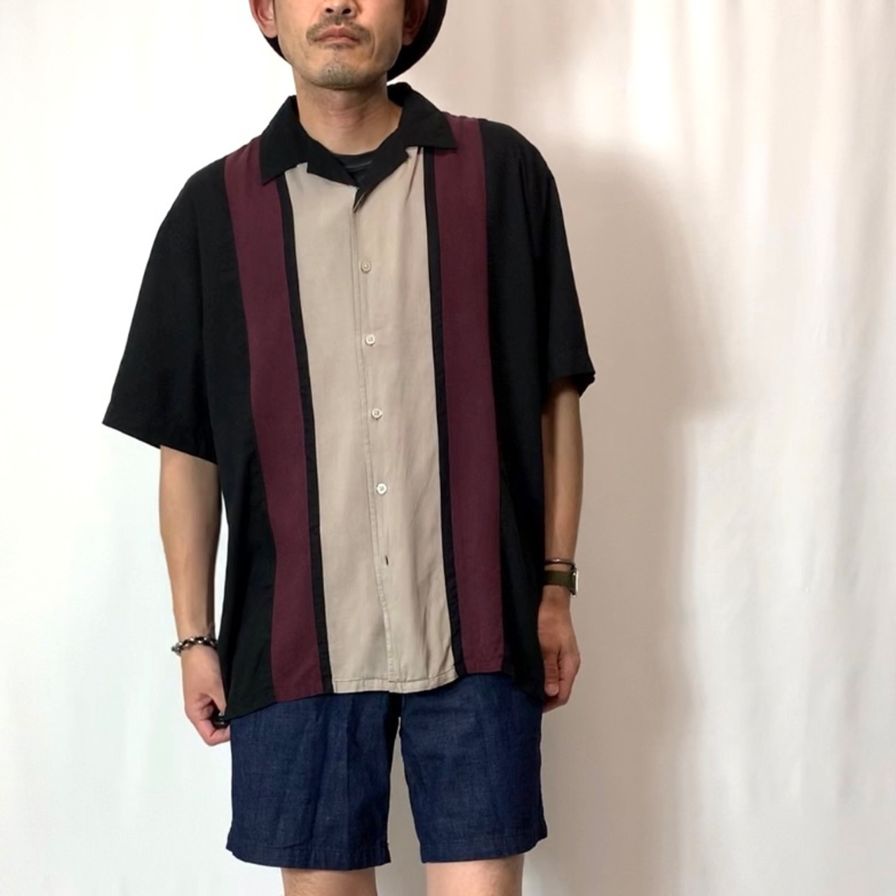 vintage old 90s Silk Line Design Shirt Box Shirt switching Panel pattern AXIST 半袖 シルクラインデザインシャツ 切り替え パネル柄 メンズ レディース SIZE XL ビンテージ ヴィンテージ