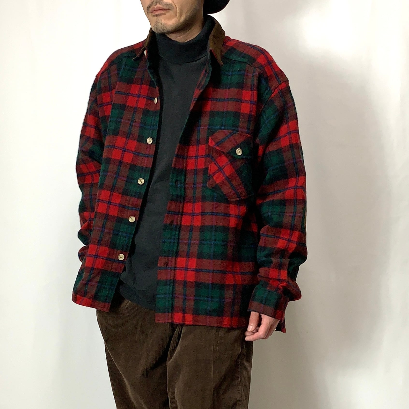 vintage old 80s Woolrich Leather Switching Wool Check Shirt ウールリッチ レザー切り替えウールチェックシャツ メンズ レディース レッド×グリーン×ブルー ビンテージ ヴィンテージ