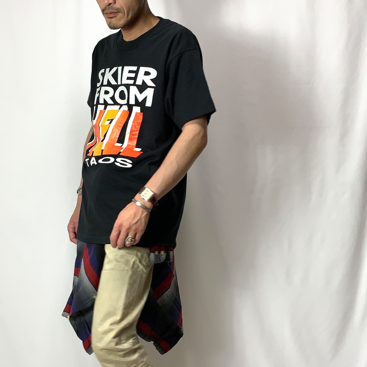 黒ボディでスキーヤー…ちょっとイメージが湧かないですが、そんなのも面白いこちらのTシャツ‼︎